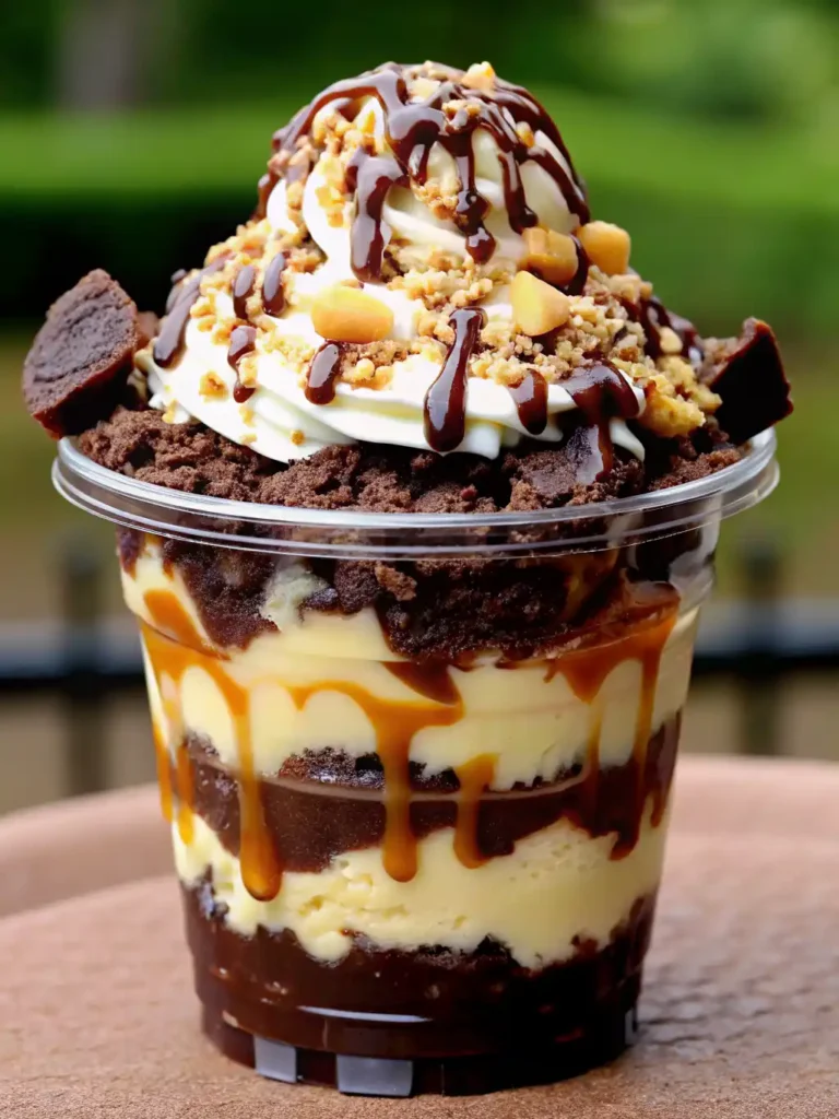 - Finish with a garnish of extra brownie crumbs, more chocolate ganache, and an additional drizzle of caramel sauce.